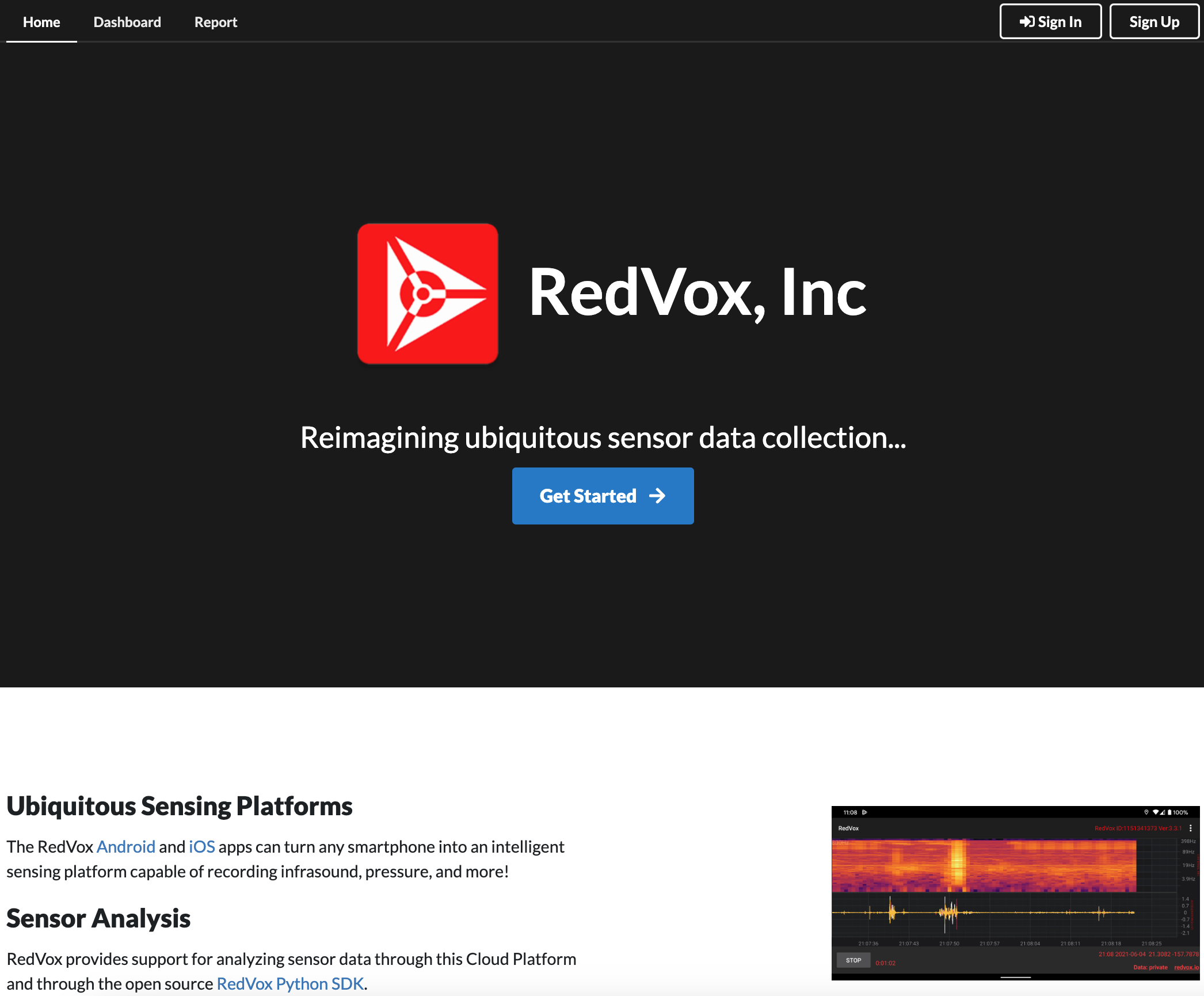 The RedVox website is located at https://redvox.io. The home page looks like this: